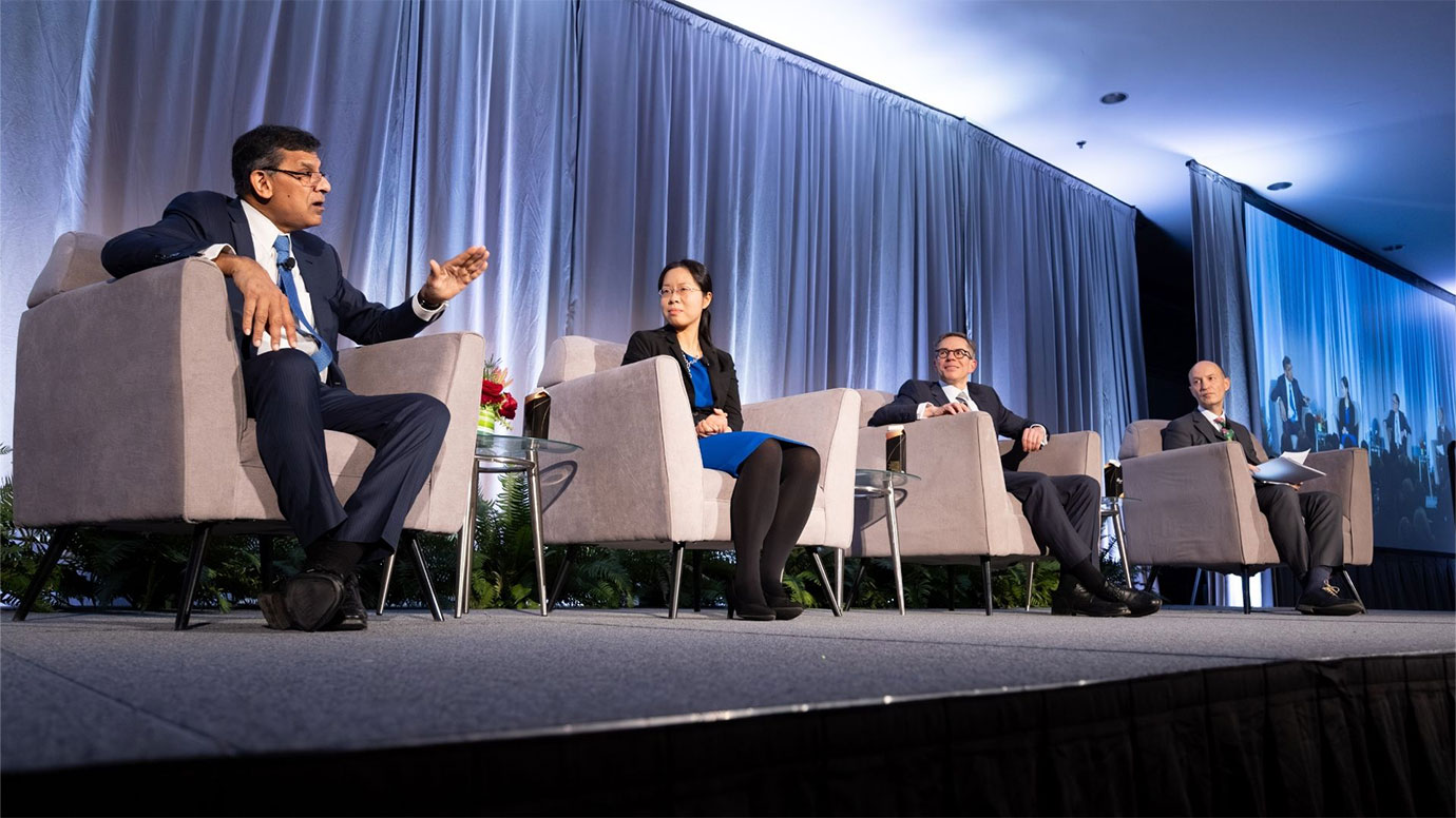 The panel featured UChicago’s Randall S. Kroszner, the Norman R. Bobins Professor of Economics; Yueran Ma, the Carhart Family Professor of Finance; and Raghuram G. Rajan, the Katherine Dusak Miller Distinguished Service Professor of Finance. The conversation was moderated by Hal Weitzman, adjunct professor of behavioral science and executive director for intellectual capital at Booth.