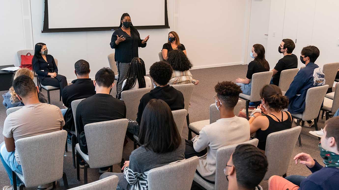 The groups of 30 to 40 new UChicago students spent their morning and early afternoon taking part in interactive engagement workshops, including one about active listening designed by the Center for Identity + Inclusion and another that aimed to put the University’s unique approach to civic engagement in context and offer a primer in engaging thoughtfully. Community partners like Walton then met with students to speak to their on-the-ground work, their neighborhoods, the challenges they’re addressing first-hand, the opportunities they see for the city, and how students can engage and learn more during their time in Chicago.