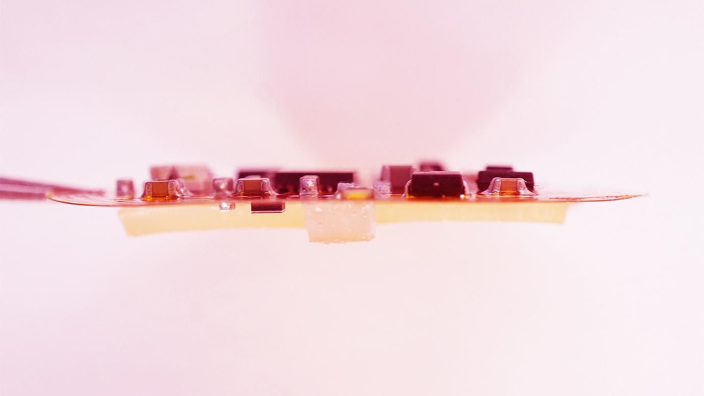 They created a device with three components. The framework is a thin, flexible electronic circuit with sensors. It is overlaid with a gel created from tapioca starch and gelatin, which is ultrasoft and mimics the makeup of tissue itself. Lastly, S. epidermidis microbes are tucked into the gel.